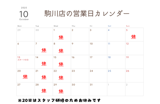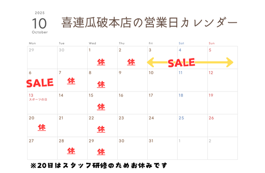 2025年10月のお休みをご案内いたします。