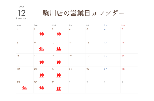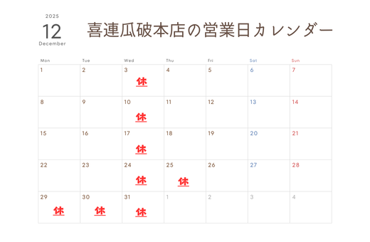 2025年12月のお休みをご案内いたします。