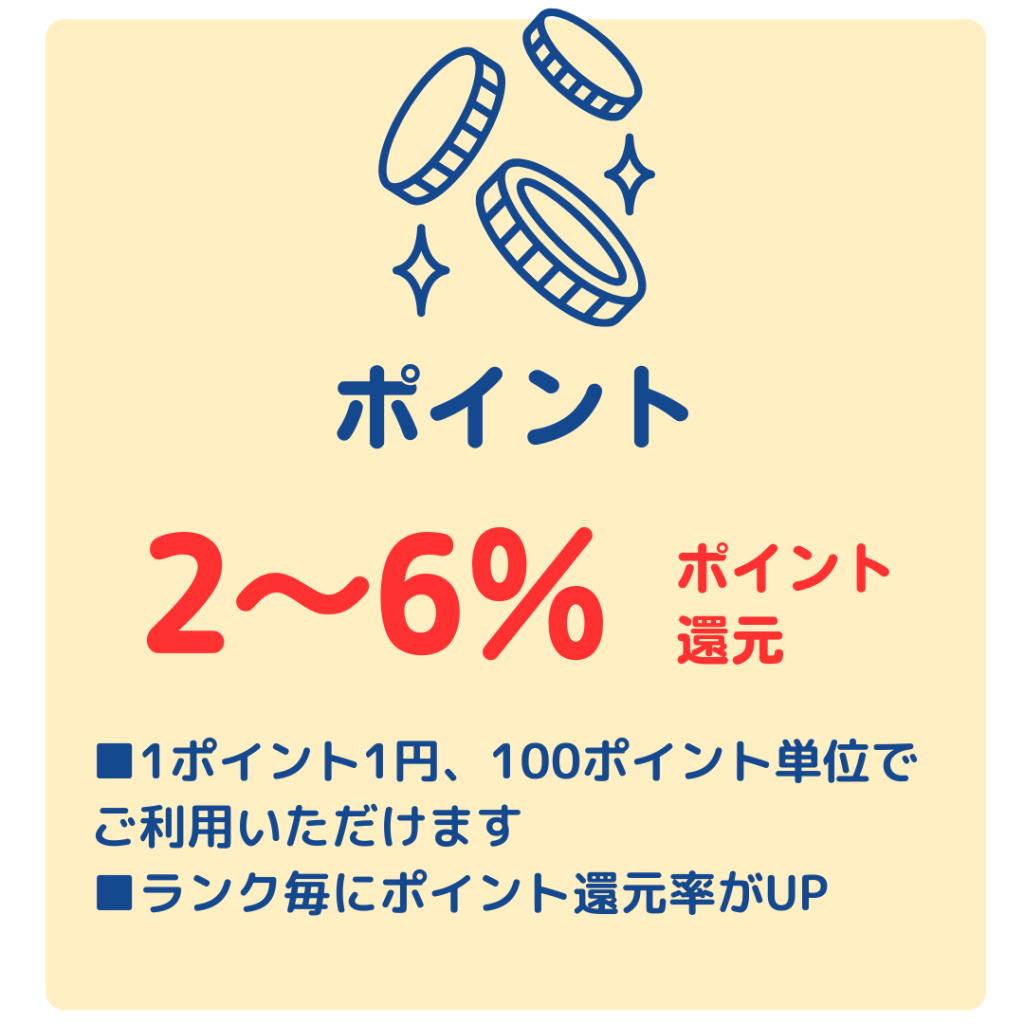ランク更新前のお会計時には、「メンバーシップ」での還元率2%(2025年10月より)でのポイント還元となります。ブロンズ会員様・ブラック会員様は、ご注文時の備考欄にて「会員登録しました。ブロンズ会員です」等のコメントをいただけましたら、お会計前に更新させていただきます。